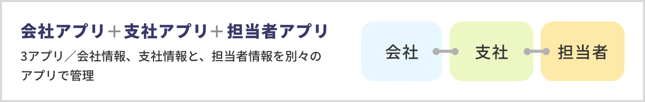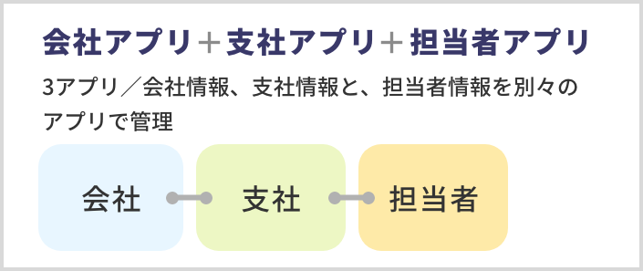 会社アプリ、支社アプリと、担当者アプリを別々のアプリで管理し、担当者アプリから会社アプリ、支社アプリを参照し、支社アプリから会社アプリを参照することでリレーションを形成している場合。