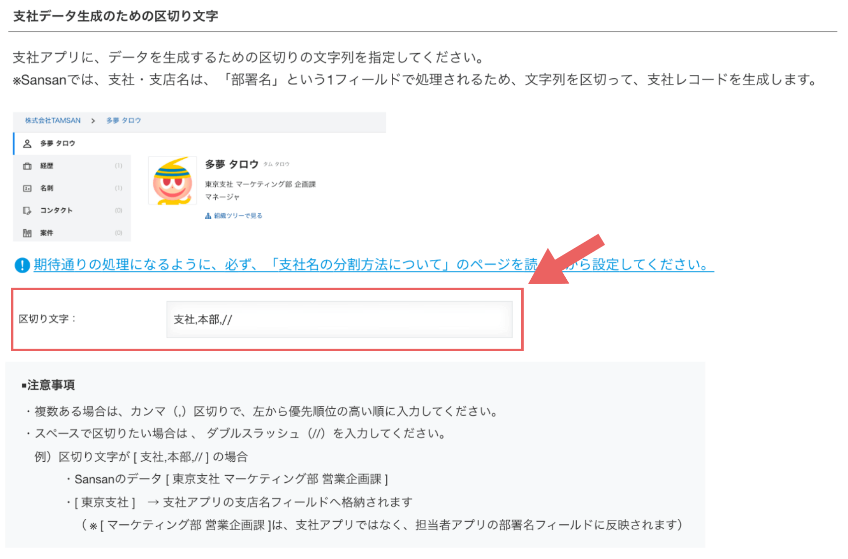 Sansanでは、支社・支店名は、「部署名」というフィールドで処理されるため、文字列を区切って、