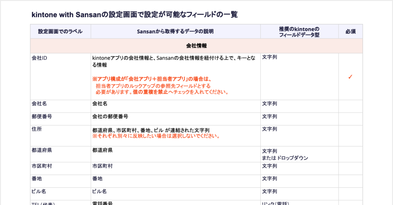 その他の設定可能なフィールドについては、以下の「kintoneとSansanのフィールドのマッピング資料」と「設定可能なフィールドの一覧表」を確認ください。