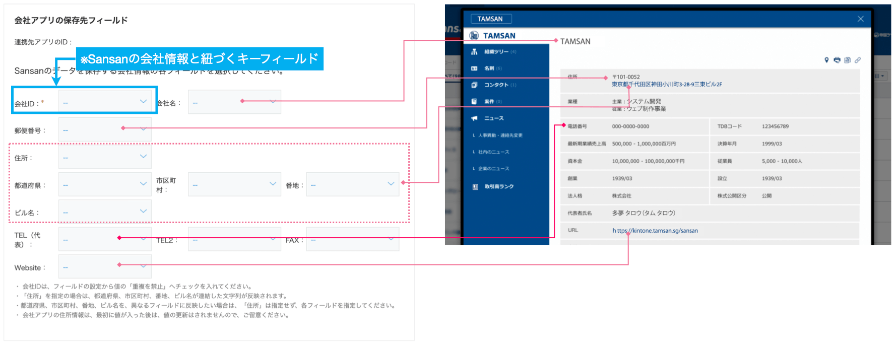 会社アプリ:kintoneフィールドと、Sansanデータとのマッピング