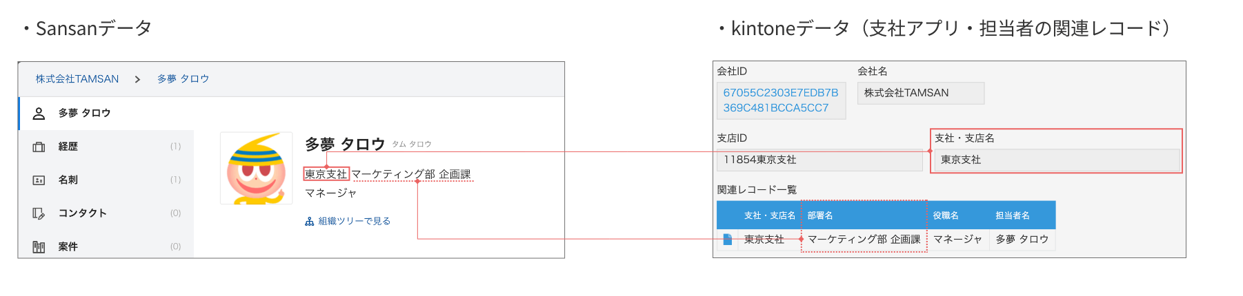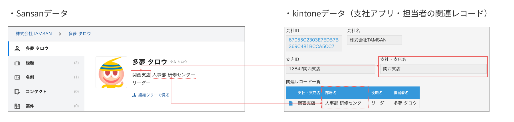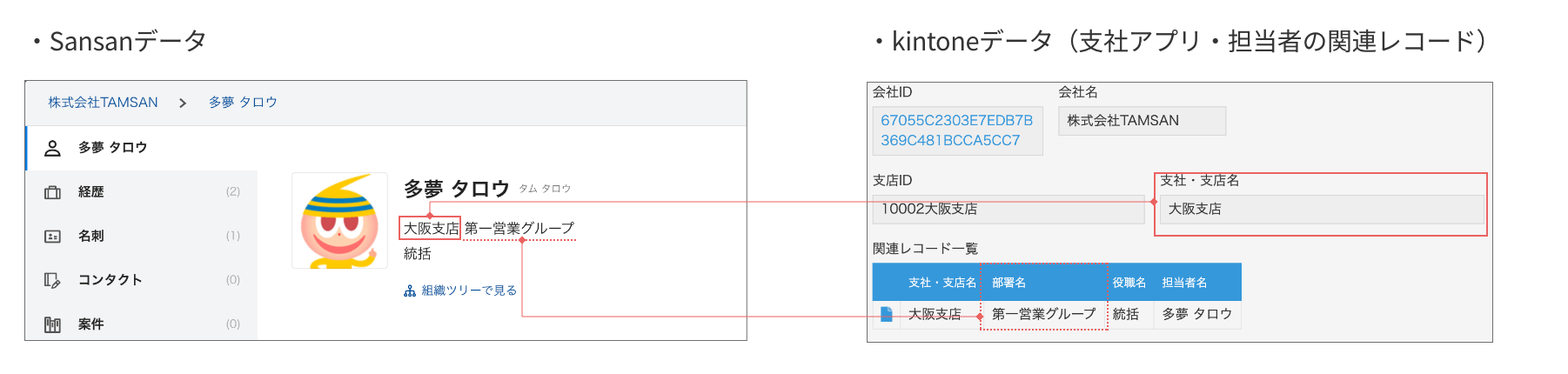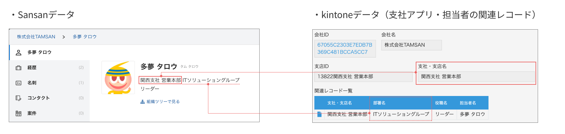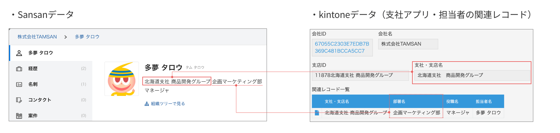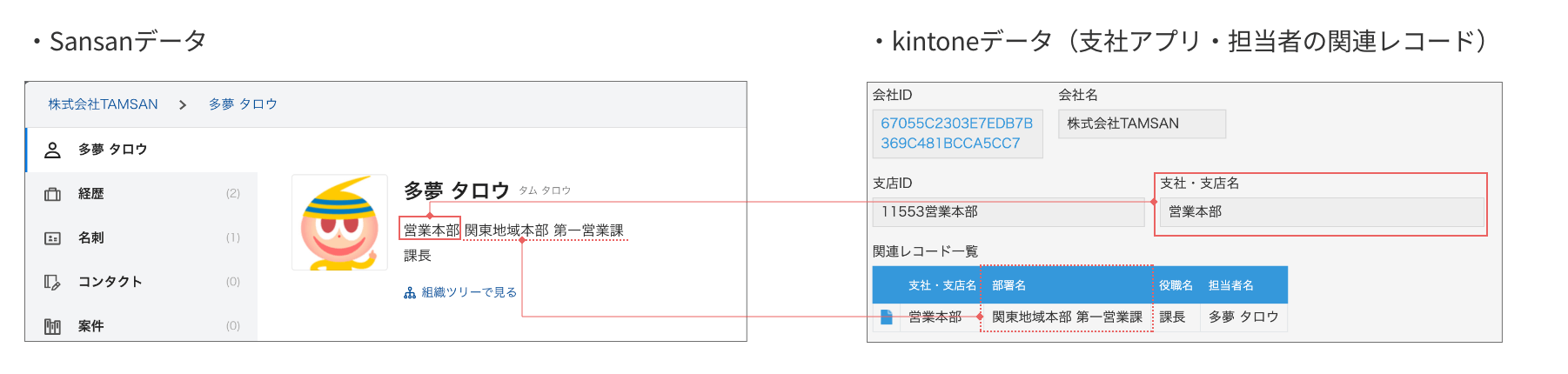 kintoneとSansanの支社名・部署名データの入るフィールドの対応関係