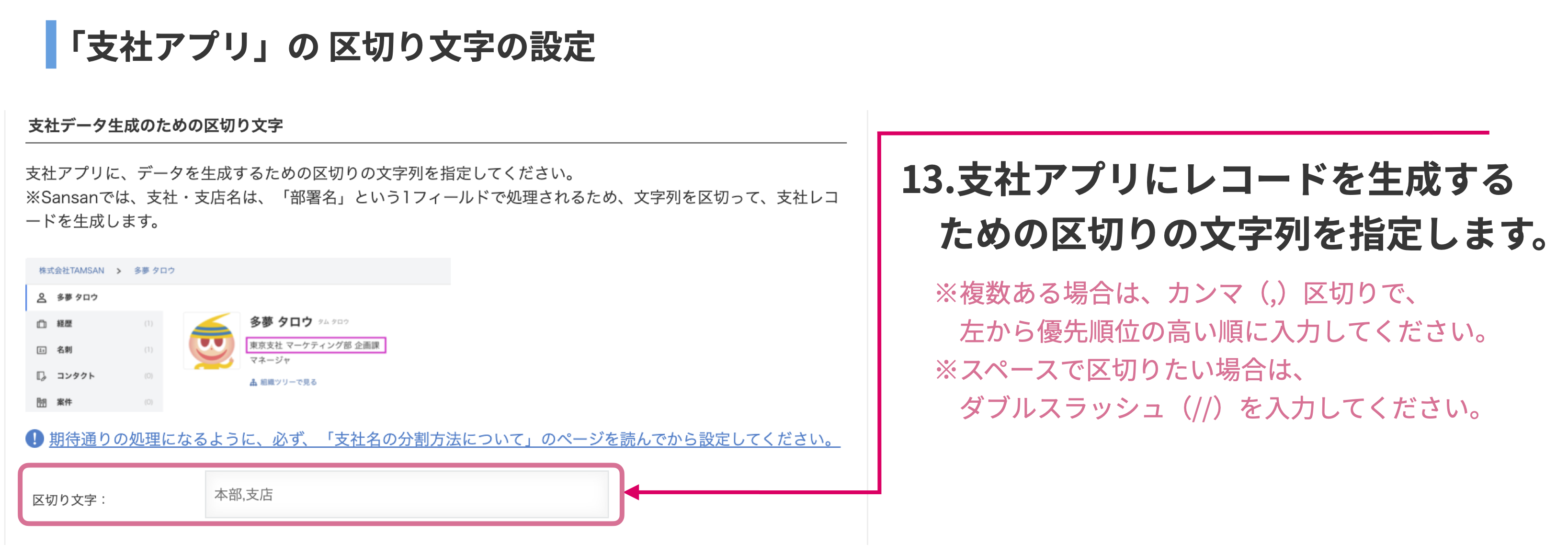 本アプリ構成では、支社アプリに、支社・支店のデータを生成するために、区切りの文字列を指定する必要があります。